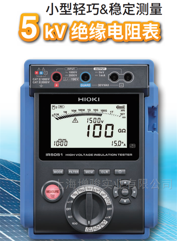测量范围广,最大10 TΩ。用于测量高压设备(变压器、线缆、马达等)的绝缘电阻。增加了光伏发电系统测试而设计。这款5kV的绝缘电阻表能轻松应对2000V的光伏发电系统测试,帮助用户在数以万计的光伏面板中迅速锁定故障位置。