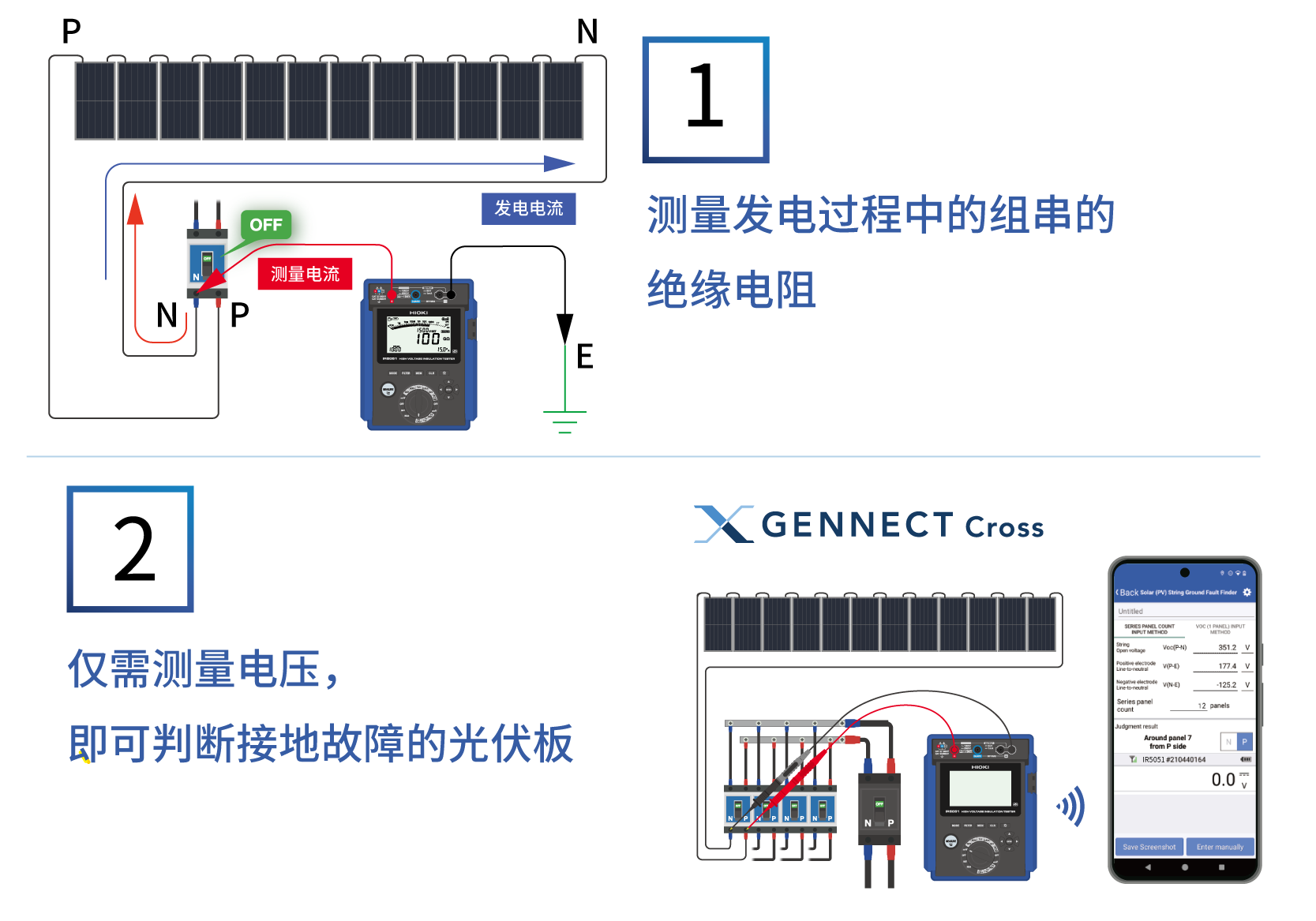 1. 测量发电过程中的组串的绝缘电阻。 在已确认存在绝缘不良的组串中找到接地故障的光伏面板。