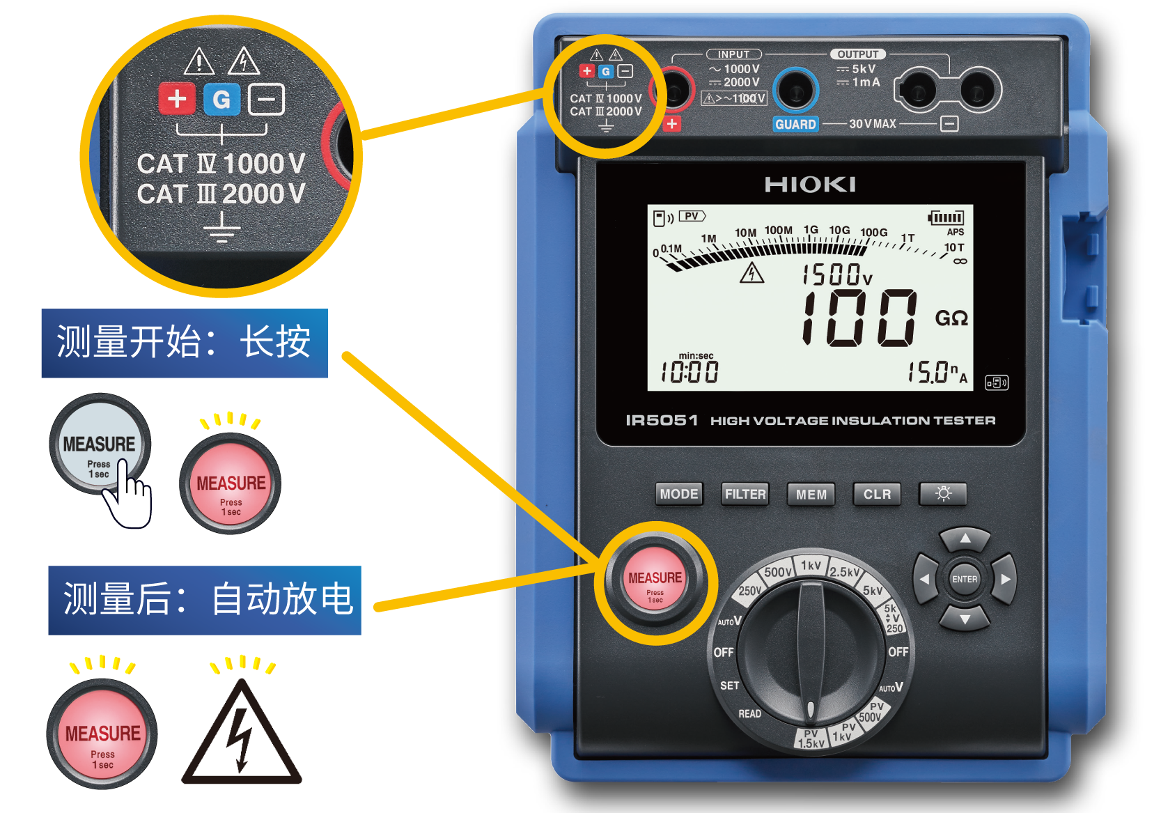 IR5051设计符合安全标准 CAT III 2000和 CAT IV 1000,具有最高的安全性能。您可能认为绝缘电阻测量是在断电条件下进行的,所以并不危险。 然而,IR5051具有更强的安全功能,以防发生意外。