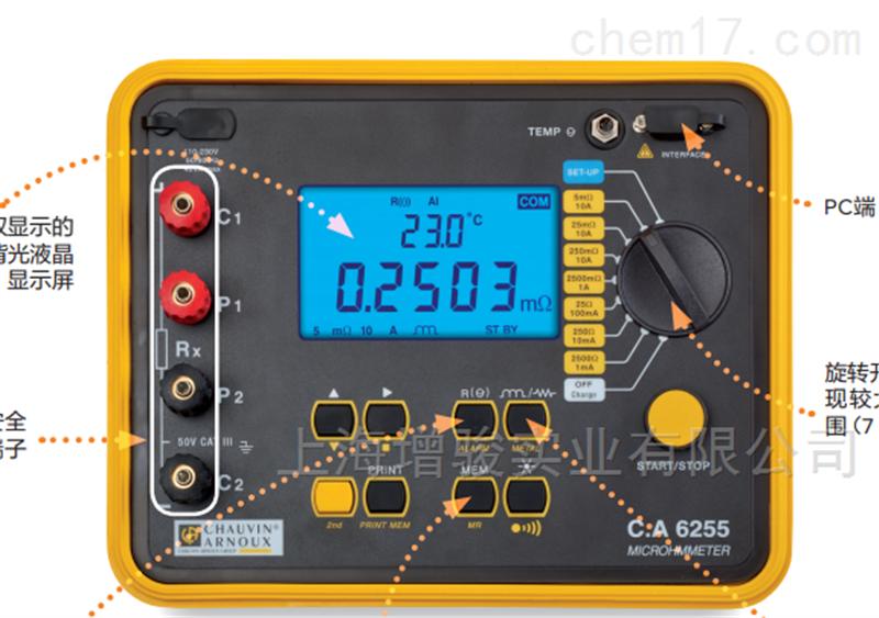 法国CA 6292高精度微欧计可调测试电流从5至200A,可调测试时间从5至120秒,可使用选配的电流探棒做BSG接地测试,测试电流高达200A低接触电阻精确测量,测试电阻从0.1μΩ至1Ω,0.1μΩ 高分辨率.冷却系统可以使连续测试变的可行,背光显示功能。 数字显示带数据存储功能,可调测试电流和测试时间,并可通过应用软件生成报告。