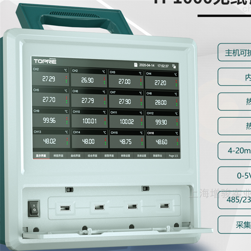 TP1000无纸记录仪支持温度、湿度、电流、电压、压力、液位、流量、位移等同时测试,采用简约外观设计,轻便易用,可无线远传至电脑IE&手机微信监控.