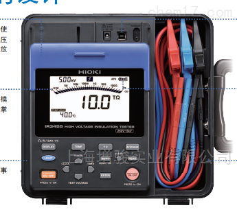 功能绝缘判断功能(温度补偿,PI/DAR显示,步进电压试验),数据存储,通讯 (USB 2.0, PC应用软件),自动放电,通电警告显示等