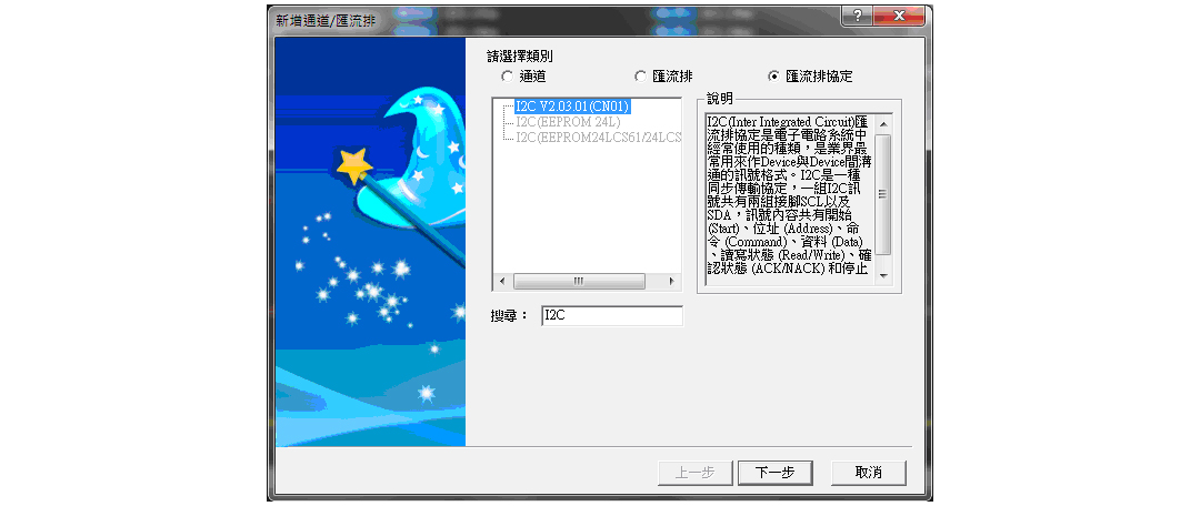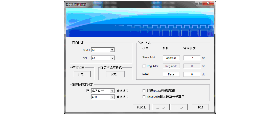 在步骤三确认总线协议后按下下一步,便会直接进入总线属性,确认脚位以及参数数据便完成整个总线协议的设定。