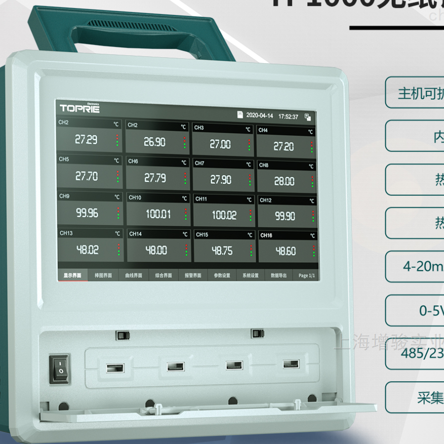 TP1000无纸记录仪支持温度、湿度、电流、电压、压力、液位、流量、位移等同时测试,采用简约外观设计,轻便易用,可无线远传至电脑IE&手机微信监控.