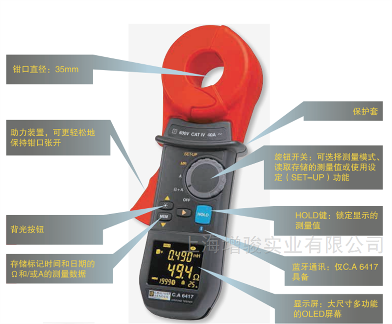 法国CA 6417钳形接地电阻测试仪具有坚固耐用的特点。同时,由于使用高性能的磁性材料,所以减少了机器的整体重量。为确保能舒适的操作使用,钳口具有一个新特点--在触发按钮装置上有一个助力装置,只需使用最小的力气,便能让钳口保持张开,使得手部操作更舒适,减轻疲劳感。配备高品质的OLED显示屏,具有更清晰的对比度,更加锐利鲜明的影像及更好的成色效果;在各种环境条件下,都可从它的180°视角清楚辨识: